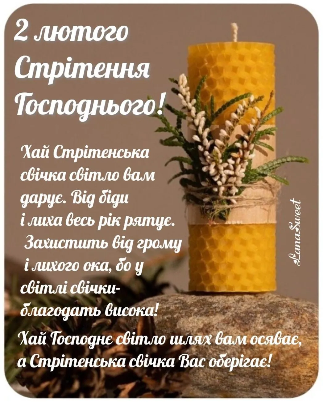 Окрім привітань, не забудьте про давню традицію – запаліть сьогодні стрітенську свічку. Вона вважається потужним оберегом від негоди та хвороб. А дивлячись на вогонь, загадайте найзаповітніше бажання – у такий великий день воно обов’язково буде почуте.